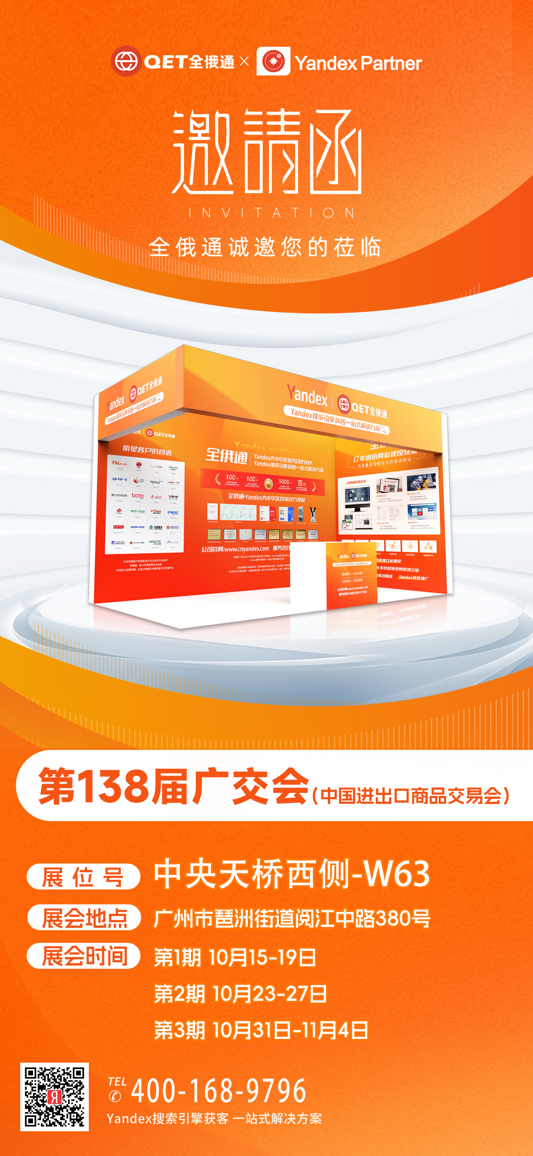 金秋十月,丹桂飘香,全俄通Yandex诚邀您相聚广州,共赴138届中国进出口商品交易会(广交会),让我们携手一起探索外贸出海的更多可能。
