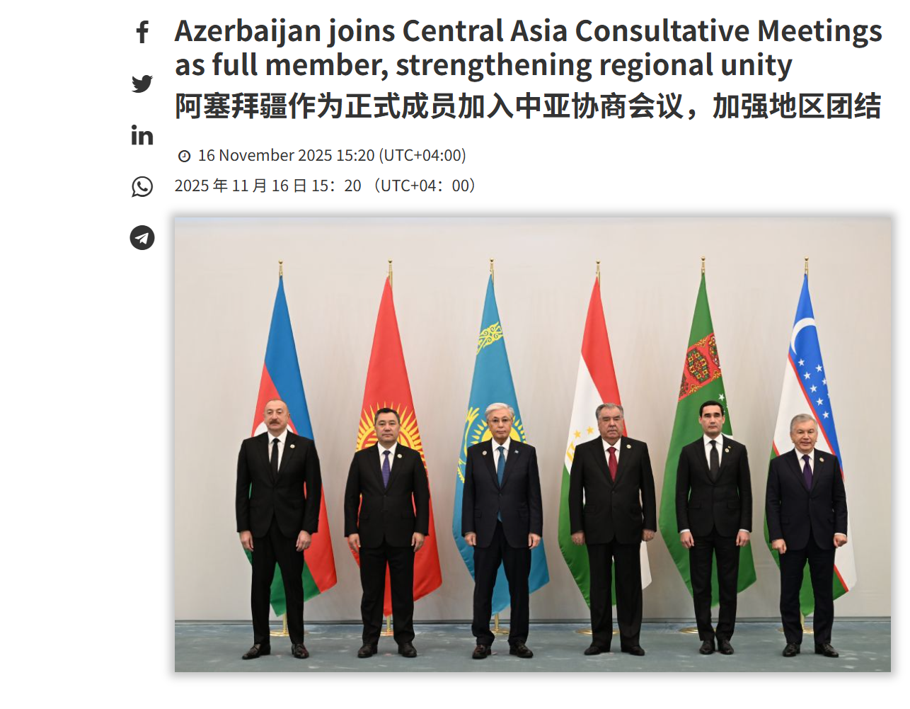 最近,中亚圈发生了一件地震级的大事,1116日在第七届中亚国家元首协商会议上,中亚五国一致同意将阿塞拜疆纳为正式成员国,将原来的C5机制扩展为C6