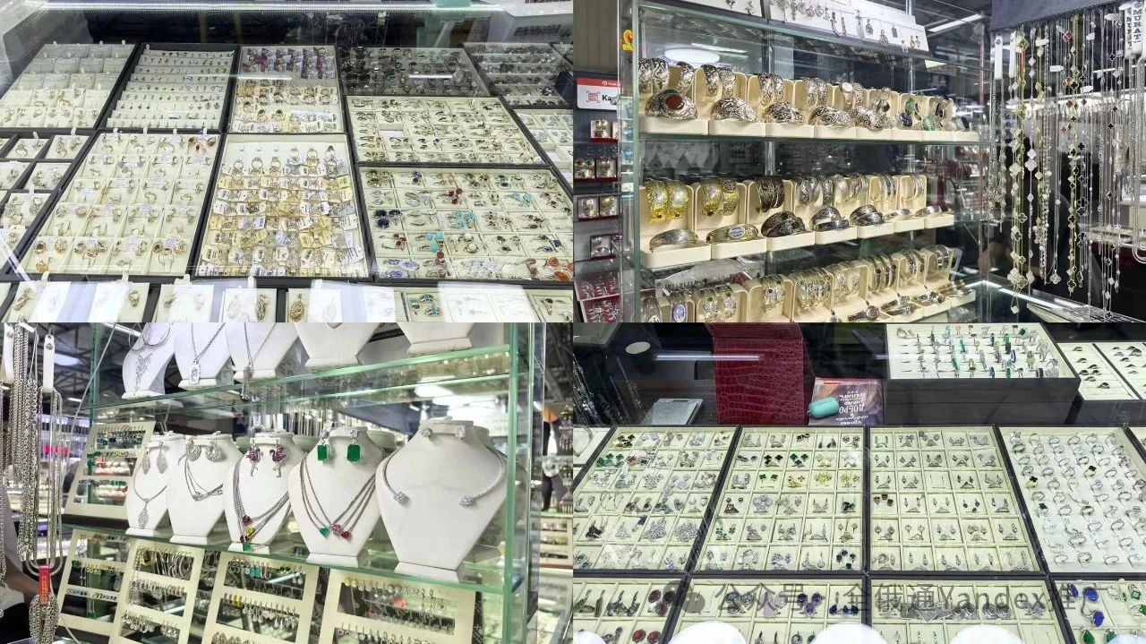 他们在配饰类的款式我是最震惊的,无论是耳环、手镯、项链都有一个共同特点就是要有一颗大宝石,我问了当地的档口老板为什么都是这种款式,老板说有以下两种原因,一个是哈萨克斯坦以前是游牧民族,他们认为宝石之类的是财富的象征,第二个是当地宝石矿产资源丰富,导致很多宝石都被用于在配饰上面,这两个原因导致现在在当地的配饰市场里基本都是花纹+大宝石为主,像国内的精致小配件很少见到有档口在卖。